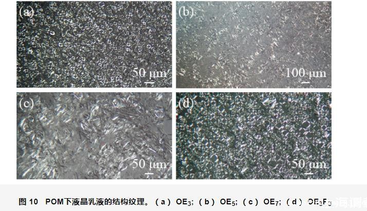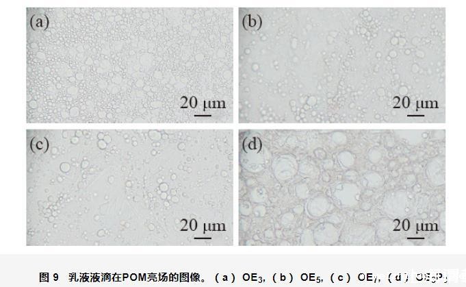 图9乳液液滴在POM亮场的图像。(a)OE3,(b)OE5,(c)OE7,(d)OE3P3