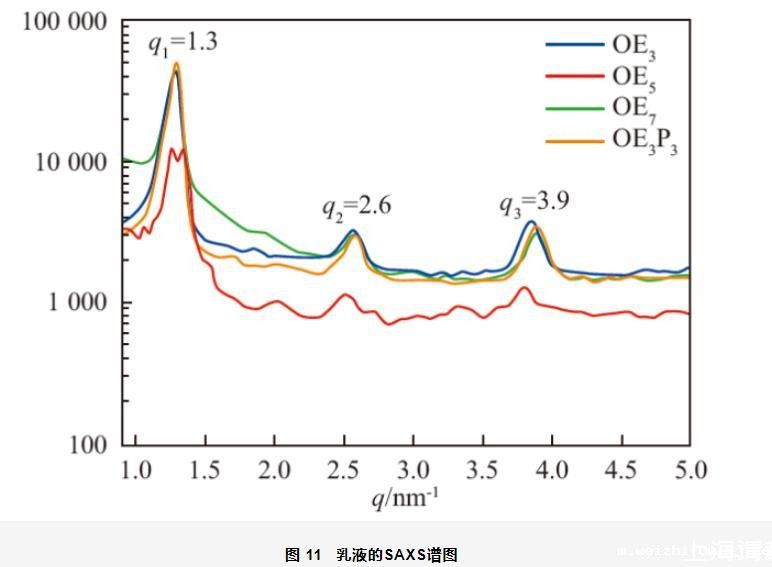 对乳液进行了SAXS测试,结果如图11所示。由图可知,4种乳液的SAXS谱图中都出现了3组衍射峰,且q1∶q2∶q3满足1∶2∶3,进一步证明了乳液的层状液晶结构,q2处明显的衍射峰表明液晶结构的长程有序,使乳液不容易发生结块或絮凝等,起到稳定乳液的作用。另外,以OE5为乳化剂制备的乳液的SAXS谱图中出现了很多毛刺,说明样品的有序性较差。