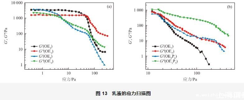 4种乳液的应力扫描结果如图13所示。从图13(a)中可以看出,以OE3和OE5为乳化剂制备的乳液存在线性黏弹区,当应力低于屈服应力时,乳液的弹性模量(G')大于黏性模量(G''),表明乳液主要以不稳定的弹性形式存在,乳液的不稳定性主要与大量的水和液体石蜡有关;当应力大于屈服应力时,G'和G''都开始降低,说明乳液内部的微观结构发生了一定程度的破坏。从图13(a)还可发现,以OE3为乳化剂制备的乳液比以OE5为乳化剂制备的乳液的线性黏弹区宽,说明前者乳液的稳定性较强,体系不容易沉降或者分层。从图13(b)中可以看出,以OE7和OE3P3为乳化剂制备的乳液在测定的应力范围内不存在线性黏弹区,当应力接近10 Pa时,两种溶液的G'和G''就开始降低,即乳液结构遭到了破坏。根据应力扫描结果发现,以OE3为乳化剂制备的乳液的稳定性明显强于其它3种乳液,这可能是因为,当分别以OE5、OE7和OE3P3为乳化剂时,由于其分子结构中长的、卷曲的EO链和支化的PO链在液滴表面形成的界面层不够稳定所致。