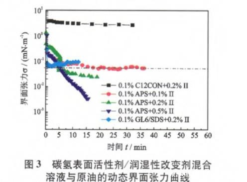 图3为典型的碳氢表面活性剂/润湿性改变剂混合溶液与原油的动态界面张力曲线。从图3可以看出,0.1%C12CON+0.2%Ⅱ型润湿性改变剂、0.1%GL6/SDS(混合质量比为4∶1)+0.2%Ⅱ型润湿性改变剂混合溶液与原油的界面张力分别为2.573 2 mN/m和0.063 5 mN/m,但0.1%APS+0.2%Ⅱ型润湿性改变剂混合溶液与原油的界面张力可以达到0.024 6 mN/m。而且,0.1%APS+0.1%Ⅱ混合溶液与原油的界面张力也低于0.05 mN/m,0.1%APS+0.5%Ⅱ型润湿性改变剂混合溶液与原油的界面张力甚至可以达到小于0.003 5 mN/m的超低界面张力。