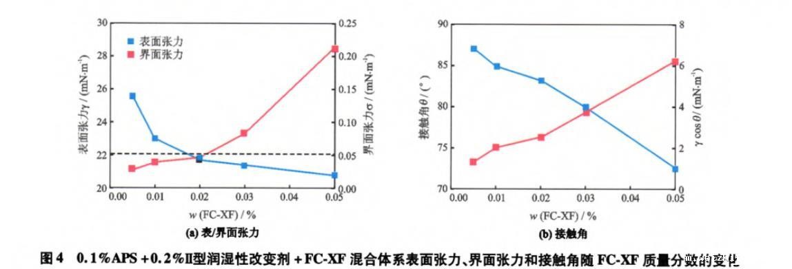 从图4(b)中可以看出,随着FC-XF质量分数由0.005%增加到0.050%,混合体系与岩石的接触角由87°降低至73°,γcosθ由1.3 mN/m上升到6.3 mN/m。这是由于吸附Ⅱ型润湿性改变剂和APS使得岩石表面由水湿转变为中性润湿(接触角>87°),更易于吸附FC-XF的碳氟链而使亲水性头基在岩石表面暴露,增加了岩石表面的亲水性,因而随着FC-XF质量分数的增加接触角减小。