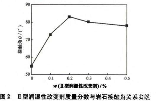图2为Ⅱ型润湿性改变剂质量分数与岩石的接触角之间的关系。从图2可以看出,随着Ⅱ型润湿性改变剂质量分数的增加,接触角由55°逐渐增大,当加入0.2%Ⅱ型润湿性改变剂时接触角可达到83°,继续增加浓度接触角略有减小,但都大于75°。