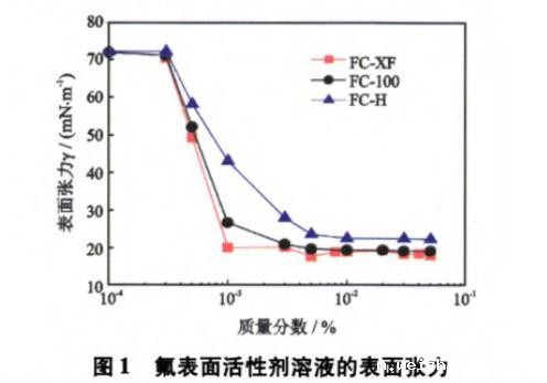 图1为3种氟表面活性剂的表面张力曲线。从图1可以看出,随着氟表面活性剂浓度的增加,溶液表面张力迅速下降,当浓度达到临界胶束浓度(cmc)后,随着浓度的增加,表面张力趋于稳定。3种氟表面活性剂FC-XF、FC-100和FC-H水溶液的cmc分别为0.001%、0.003%和0.005%,最低表面张力γcmc分别约为19、19.5和22.5 mN/m。因此,两性氟表面活性剂FC-XF比2种非离子型氟表面活性剂具有更强的降低表面张力效率(低cmc)和能力(低γcmc),而且两性型氟表面活性剂也不存在非离子型表面活性剂在更高温度下氧乙烯基团失去亲水性而不溶于水的问题。因此选择FC-XF作为助排剂中的氟表面活性剂。