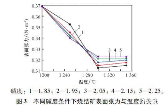 图3不同碱度条件下烧结矿表面张力与温度的关系
