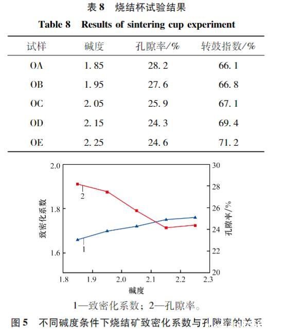 在碱度为1.85~2.25范围内,烧结试验表明,致密化系数与实测孔隙率呈现显著的负相关关系(F_{Den}越大,孔隙率越小)。致密化系数与烧结矿的转鼓指数(强度)在碱度1.85~2.15范围内呈正相关(F_{Den}越大,强度越高)。在碱度提高至2.25时,虽然计算F_{Den}继续增大,但实际烧结矿受高碱度下矿相变化(如硅酸二钙晶型转变)影响,孔隙率微升,强度微降,表明优化碱度在2.15附近为佳。