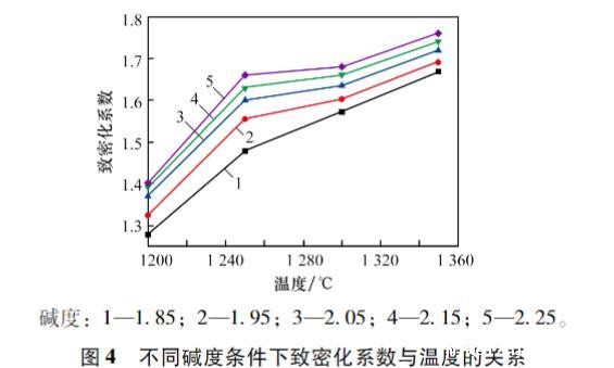 在烧结过程中,熔体表面张力是主要驱动力,而熔融混合物的表观黏度是主要阻力。因此,这两个因素是定量分析烧结过程中聚结行为的关键。根据公式(5),并参考文献[17]中A和E的拟合值(A=1,E=1为简化表征,实际计算中按该假设进行相对值比较),计算得到了不同碱度及温度条件下烧结矿的致密化系数F_{Den},结果如图4所示。