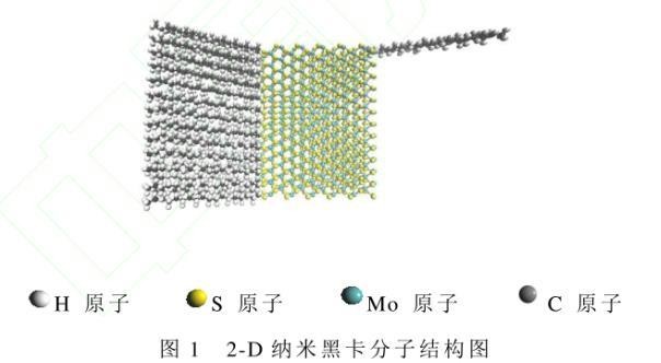 2-D纳米黑卡具有双层结构,由大小为30Å×40Å×12Å的二硫化钼纳米片与直链烷烃构成。假设理想状态下二硫化钼纳米片无晶格缺陷,其活性位点位置确定可参见文献,且全部被C18H38直链烷烃接枝,如图1所示。