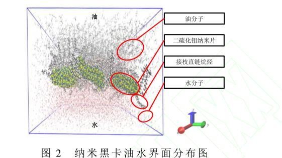 计算水分子、油相分子和纳米黑卡之间的相互作用,截断半径分别为10Å和12Å。所构建的油水界面体系由31 500个油分子和17693个水分子组成,并将纳米黑卡置于所构建的油水界面体系中。如图2所示,油水界面上层部分的碳氢链表示油分子,油水界面下层区域代表水分子。