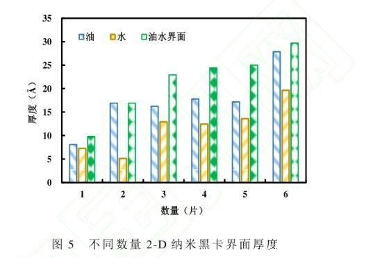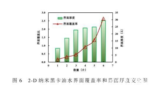 假设2-D纳米黑卡全部平铺在油水界面,其表面积与油水界面面积的比值即为界面覆盖率(RIC)。不同数量的纳米黑卡在油水体系中的界面覆盖率和界面厚度见图6。界面覆盖率与界面厚度随着纳米黑卡数量的增加逐渐增加,且界面覆盖率呈指数增加,而界面厚度呈对数增加,纳米黑卡数量由1增至6时,界面覆盖率分别为0.16、0.31、0.46、0.91、1.34和2.64。当纳米黑卡数量增加到一定程度时(纳米黑卡数量为4片),油水界面几乎全部被覆盖,界面覆盖率在1左右,此时的界面厚度达到相对稳定的状态,界面呈单层且平铺吸附状态;当黑卡数量继续增加,界面覆盖率指数增加,界面厚度也随之增加,此时纳米片呈受挤压状态,出现褶皱态和重叠叠加态,继续增加纳米黑卡数量,界面达到饱和,界面厚度不再增加,多出的黑卡分散在水溶液中,由于黑卡本身存在弱范德华相互作用,片片间不断叠加,成为团聚态,从而形成沉淀。该沉淀物质以弱范德华相互作用团聚在一起,当遇到剪切、稀释、振荡等外界作用时会重新分散在水溶液中,发挥其单片的作用。