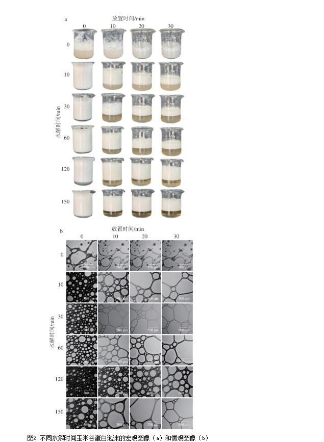 图2不同水解时间玉米谷蛋白泡沫的宏观图像(a)和微观图像(b)