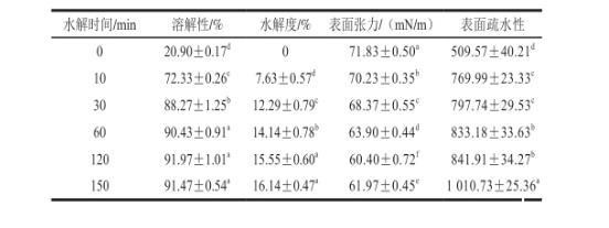 表1水解时间对玉米谷蛋白溶解性、水解度、表面张力和表面疏水性的影响