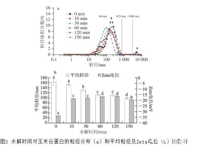 图3水解时间对玉米谷蛋白的粒径分布(a)和平均粒径及Zeta电位(b)的影响