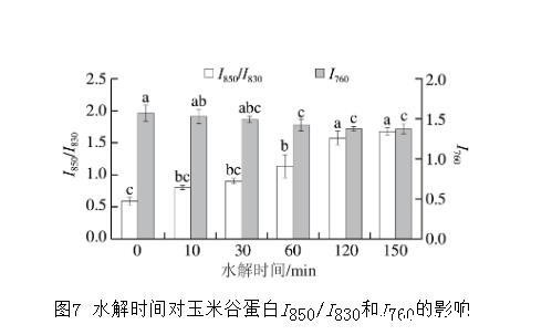 图7水解时间对玉米谷蛋白I850/I830和I760的影响