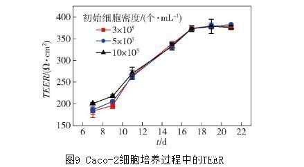 单层Caco-2细胞模型的完整性和致密性可以通过TEER进行评估。一般情况下,认为当单层细胞的TEER高于300Ω·cm2时,单层Caco-2细胞就可以用于进一步的实验。图9为不同初始密度的单层Caco-2细胞两侧的跨膜电阻随培养时间的变化情况。由图9可知,整个实验周期,单层Caco-2细胞的初始接种密度对最终电阻的影响不大。前期细胞跨膜电阻变化缓慢,培养9 d后,跨膜电阻出现大幅度增长,在培养17 d后的电阻趋于稳定,最后的电阻稳定于375Ω·cm2附近,表明单层Caco-2细胞模型具有中度紧密度。