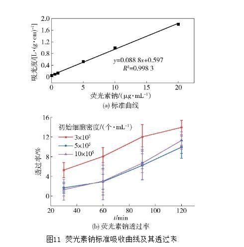标记物跨膜通量的测定也可以反映单层细胞膜的完整性,荧光素钠标准吸收曲线及其在不同时间段的透过率见图11。由图11(a)的荧光素钠的标准曲线方程中,代入BL侧的吸光度,可计算出BL侧的荧光素钠质量,根据式(4),即可得出不同时间段的荧光素钠透过率[图11(b)]。由图11(b)可知,孵育2 h后,3个不同初始密度的细胞模型均对荧光素钠具有一定的透过性。初始细胞密度为3×105个/mL的细胞模型对荧光素钠的透过率相对较高,达到13.96%;初始AP侧加入荧光素钠的密度为20μg/mL,最终3种模型的荧光素钠透过量均小于0.011 6μg/min,说明3种细胞模型单层膜的致密性能良好。