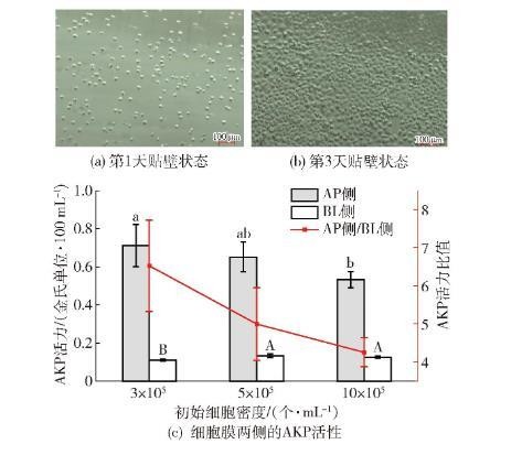 Caco-2细胞培养状态及培养21 d后的碱性磷酸酶活性见图10。由图10(a)、(b)可以发现,培养3 d过程中,单层Caco-2细胞生长稳定并均匀分布在Transwell上,贴壁情况良好。碱性磷酸酶AKP是小肠刷状缘细胞的标志酶,其浓度代表了单层Caco-2细胞的极化和功能。观察图10(c)可知,培养21 d后,不同接种细胞密度在AP侧的酶活性均高于BL侧的酶活性,属正常的细胞极化结果。初始密度为3×105个/mL的细胞AP侧的AKP活性高于其他两组,其BL侧的AKP活性低于其他两组,证明该组细胞分化情况较好。随着细胞密度的增大,AP侧与BP侧活力的比值呈下降趋势,说明初始细胞密度过大不利于细胞的分化。实验结果表明,3种模型细胞均生长良好。