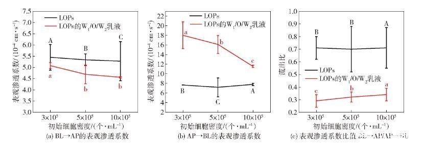 图(a)和图(b)中,不同大写、小写字母分别表示LOPs、LOPs双重乳液的组间表观渗透系数存在显著差异(P<0.05),图(c)中,不同大写、小写字母分别表示LOPs、LOPs双重乳液的组间流出比存在显著差异(P<0.05)。