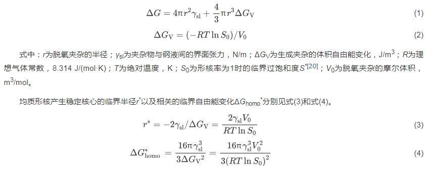 均质形核产生稳定核心的临界半径r*以及相关的临界自由能变化ΔGhomo*分别见式(3)和式(4)。