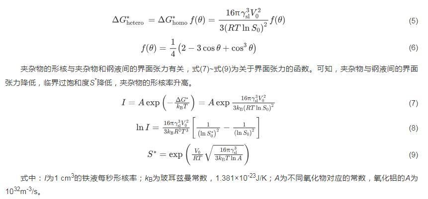 夹杂物与钢液间的界面张力不仅会影响夹杂物的形核率,还会影响形核半径的大小。以Al2O3为例,Al2O3的形核半径和钢液与Al2O3的界面张力的关系可以用式(10)来描述。