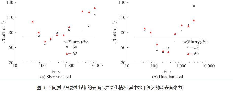不同质量分数水煤浆表面张力的变化情况如图4所示。可以看出:不同条件下水煤浆的动态表面张力变化情况比较一致,随着特征气泡时间(t)的增加,动态表面张力均先减小后增加,在气泡特征时间为200 ms附近出现最小值;而水煤浆的动态表面张力与静态表面张力存在显著差异,在气泡特征时间较小或较大时,动态表面张力均大于静态表面张力。