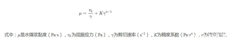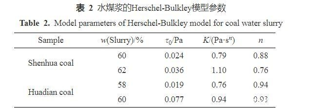 式中:是水煤浆黏度(Pa·s),为屈服应力(Pa),为剪切速率(s−1),K为稠度系数(Pa·sn),n为流变指数。拟合关系式相关系数为0.98,拟合参数见表2。