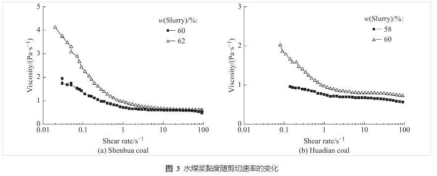 黏度、屈服应力等水煤浆的流变特性对浆体破裂过程有重要影响。在水煤浆中,煤粉颗粒、分散剂和水形成了相对稳定的三维空间结构,此时未被吸附、未参与形成紧密水化膜的自由水分布在这种三维结构的空隙中。这种空间结构在遭受剪切时很容易被破坏,从而导致分布在三维空间结构空隙中的自由水被释放,黏度降低;同时,剪切应力越大,水煤浆的黏度越小,所以水煤浆一般为剪切变稀的假塑性流体。