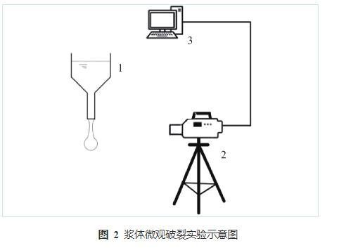 水煤浆的流变特性采用Bohlin CVO型马尔文旋转流变仪测量。表面张力的测量方法主要有吊片法、液滴-鼓泡法以及微观界面面积测量法等。本实验基于液滴-鼓泡法使用SITA science line t100型全自动表面18luck国际对煤浆的动态表面张力进行了测量,并与新利18澳门公司生产的Delta-8全自动高通量表面18luck国际的静态表面张力进行比较。采用液滴-鼓泡法测量动态表面张力时,将特制毛细管伸入待测液体,空气经由毛细管进入液体,毛细管出口气泡形成外凸,气泡的半径也随之连续不断减小。气泡在液体中受到表面张力的挤压,气泡半径越小,压力就越大,然后通过测量压力的变化获得表面张力。测量动态表面张力时,通过控制空气进入毛细管的流量来改变气泡半径变化速率,其涉及的特征气泡时间也称气泡寿命,是指在鼓泡过程中从气泡形成外凸到气泡半径达到最小值的时间间隔。水煤浆破裂实验中,浆体通过喷嘴滴出,喷嘴内径为4.18 mm。使用Photron Fastcam SA2型高速相机拍摄水煤浆破裂过程,并使用开源软件ImageJ分析处理得到的图片。浆体微观破裂实验示意图如图2所示。