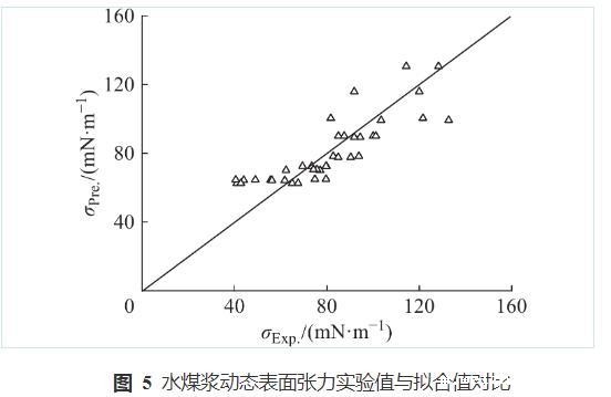 从图4中可以看出,随着特征气泡时间的增加,与表面活性剂溶液不同,水煤浆的动态表面张力呈现了非单调的变化特性。当气泡变形速度较快即特征气泡时间小于100 ms时,气泡膨胀过程越快其受到煤粉颗粒的阻碍作用越大,所以水煤浆的动态表面张力随着特征气泡时间的增加而逐渐减小;当气泡变形速度较慢时,水煤浆中的煤粉颗粒、分散剂和水将会形成相对稳定的三维空间结构,气泡膨胀时需要破坏水煤浆结构,所以动态表面张力随着特征气泡时间的增加而逐渐增大。水煤浆的动态表面张力与特征气泡时间的关系式如式(2)所示,相关系数为0.83,由图5可知水煤浆动态表面张力的实验值(Dm,EXP)与拟合值(Dm,pre)吻合较好。