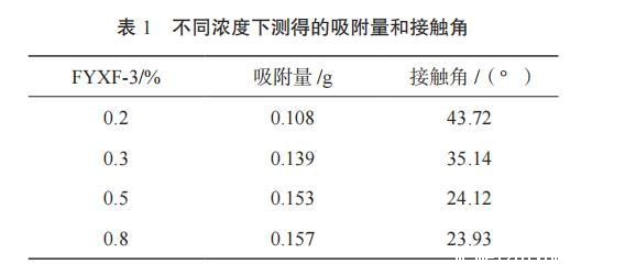 水与韩城煤粉的接触角为73.23°。在不同浓度下测悬浮剂吸附量和接触角,结果见表1。由表1可以看出,添加FYXF-3后,能大幅度地降低接触角,接触角随着FYXF-3浓度的增大而减小,浓度大于0.5%后,减小幅度变小;吸附量随着浓度的增大而增大,浓度大于0.5%后,增大的幅度变小。这说明FYXF-3浓度不小于0.5%时,能较大地增加吸附量、减小接触角,从而能有效改善煤粉表面的润湿性能,防止分散的煤粉结块而产生沉降,这样有利于悬浮煤粉并将其返排。
