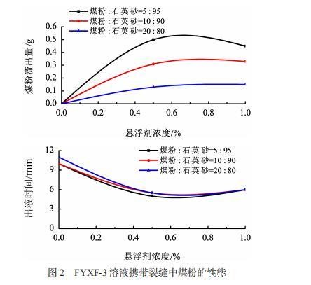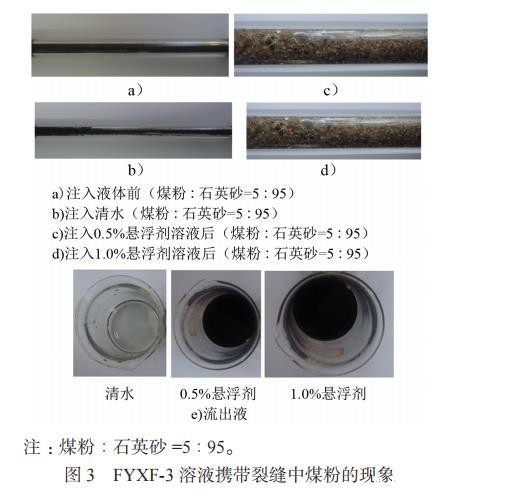 图2为FYXF-3的浓度分别与出液时间、煤粉流出量的关系图;图3为煤粉:石英砂比例为5:95时的实验现象图。
