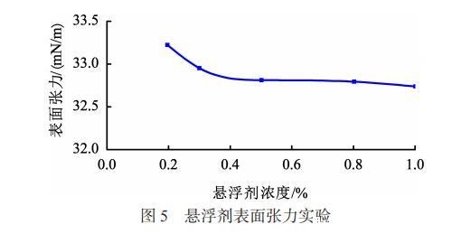 由图5看出,添加FYXF-3后,溶液表面张力降低幅度高达52.36%以上;随着FYXF-3溶液浓度的增大,表面张力逐渐减小,但浓度大于0.3%后,继续增大浓度已经无法大幅度降低表面张力。说明浓度不小于0.3%的FYXF-3溶液能够吸附在煤层表面,降低韩城现场煤粉和水之间的表面张力,使煤粉有效悬浮且快速返排。