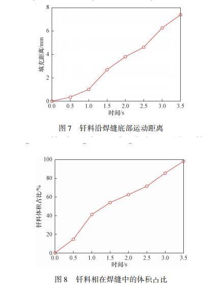 液态钎料沿着焊缝下表面的填充距离如图7所示。前1s内,钎料未润湿焊缝下表面,曲线上表示为钎料竖直向下运动的距离,此时铺展速度较为缓慢。当钎料直接接触焊缝下表面时,驱动力增强,加速了钎料的铺展。焊接过程中可能会出现微小气泡从而影响焊接强度,故统计了焊缝内不同时刻下钎料体积占总体积的比值(图8)。在t=1s之前,前沿流动速度较小,但由于填充截面面积较大,总体铺展速度仍处于较高的水平。当钎料开始向两侧流动,铺展速度略微下降。最终得到的钎料填充体积占比达到98.5%,表明焊缝填充效果良好。