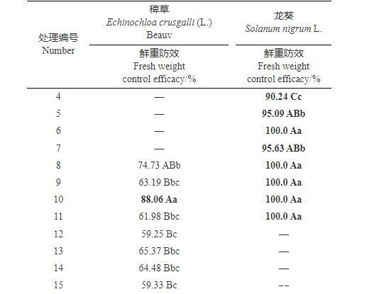 由表5数据可以看出,处理4~7对龙葵鲜重防效均在90%以上,其中最好的是添加了2#增效剂的处理6,鲜重防效为100%,其次是添加了1#增效剂的处理5和添加了3#增效剂的处理7,最差的是未添加增效剂的处理4,处理5~6与处理4差异显著,处理6与处理5、7在0.05水平上差异显著。处理8~11对龙葵效果均较佳,鲜重防效均为100%;对稗草防治效果最好的是添加了2#增效剂的处理10,鲜重防效为88.06%,其他处理防效略差,鲜重防效在61%~74%之间,处理10与处理8、9、11在0.05水平上差异显著。处理12~15对稗草的防治效果均一般,鲜重防效在59%~65%之间。