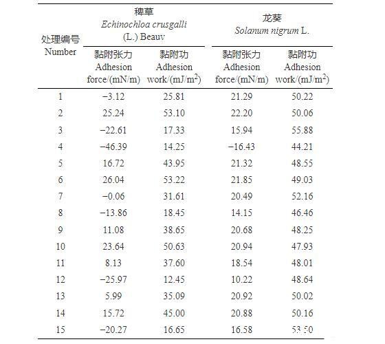 表4 15种处理作用于靶标作物时的黏附张力和黏附功