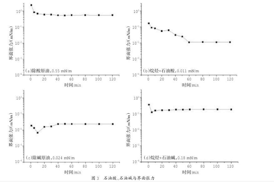 在原油剔除石油碱组分后,界面张力有所升高,为0.024 mN/m,说明石油碱对超低界面张力的形成也具有一定的作用,但不如石油酸组分作用大;在烷烃添加石油碱组分后,界面张力由1.38 mN/m降低至0.18 mN/m,1个数量级的降低,也进一步说明了石油碱组分与辽河两性表面活性剂之间具有一定的相互作用,但次于石油酸组分。该结果也证明了在辽河油田的两性表面活性剂二元复合驱中,石油碱组分也是原油的活性物质,只是作用弱于石油酸组分(见图3)。