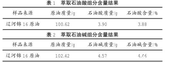 由表1、表2可以看出,辽河原油中萃出石油酸组分的含量为3.88%,萃出石油碱组分的含量为4.46%,石油碱略高于石油酸。