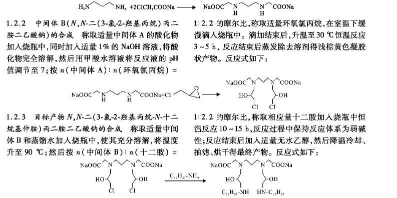 1,3-丙二胺与氯乙酸钠反应合成中间体A(N,N-丙二胺二乙酸钠);中间体A与环氧氯丙烷反应生成中间体B(N,N-二(3-氯-2-羟基丙烷)丙二胺二乙酸钠);中间体B最后与十二胺反应生成目标产物,N,N-二(3-氯-2-羟基丙烷-N-十二烷基仲胺)丙二胺二乙酸钠(简称GAC-312)。