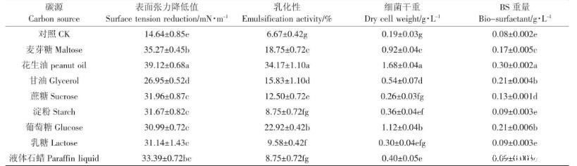 细胞表面的物质合成需要氮源,氮源的种类会对细菌细胞的生长和发酵产物的产量产生很大影响。由表4可以看出,不同氮源对细菌发酵过程中表面张力降低值的影响较小,可能与发酵液中的生物表面活性剂含量已经达临界胶束浓度(CMC)有关。当氮源为硫酸铵时发酵液表面张力降低值最大,同时乳化性、细菌干重、糖脂含量均达到最大值。这与钱晓勇等研究结果一致,硫酸铵是促进生物表面活性剂生成的较好氮源。