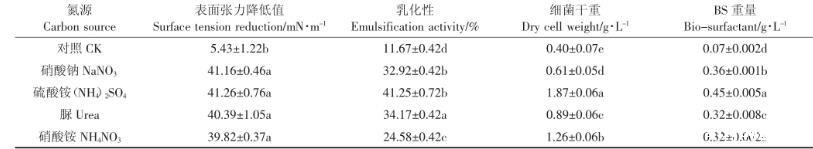 表4氮源对147细菌生长以及生物表面活性剂产量的影响