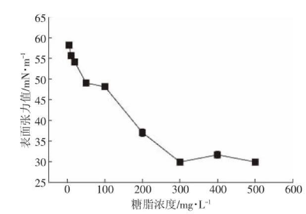 发酵产物临界胶束浓度是指分子在溶剂中缔合形成胶束的最低浓度。临界胶束浓度(Critical micelle0.005 concentration,CMC)可以作为表面活性剂表面活性的一种度量,CMC越小,改变表/界面性质,起到增溶、乳化等所需的浓度就越低。从图3可以看出:糖脂在0~300 mg·L-1时,表面张力值随着糖脂浓度的升高而降低,且在300 mg·L-1时达到最小值;在300~500 mg·L-1时,表面张力值变化不大。可得发酵粗提产物的CMC为300 mg·L-1,明显低于普通化学表面活性剂十二烷基磺酸钠(SDS)的2200 mg·L-1,能在较低浓度下使用,因而在医药、食品、化工等行业具有广阔应用前景。