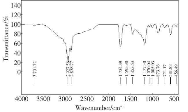 将菌株147产物提纯,红外光谱仪(FT-IR)分析物质结构,结果如图2。该物质在3701.72cm-1处有吸收峰,表明分子中有羟基存在;2 858.77~2 927.56 cm-1处的吸收峰表明存在糖类C-H的伸缩振动,1400~1200 cm-1处是C-H变角振动,1 734.39 cm-1处是C=O的双键振动,而1 070.04 cm-1处为C-O-C键伸缩振动,因此该物质中有一个五元环状内酯和糖苷键存在。由此进一步证明该生物表面活性剂含糖脂类物质。