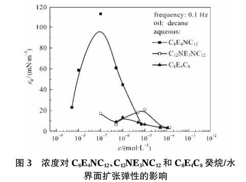 图3浓度对C8E4NC12、C12NE3NC12和C8E4C8癸烷/水界面扩张弹性的影响