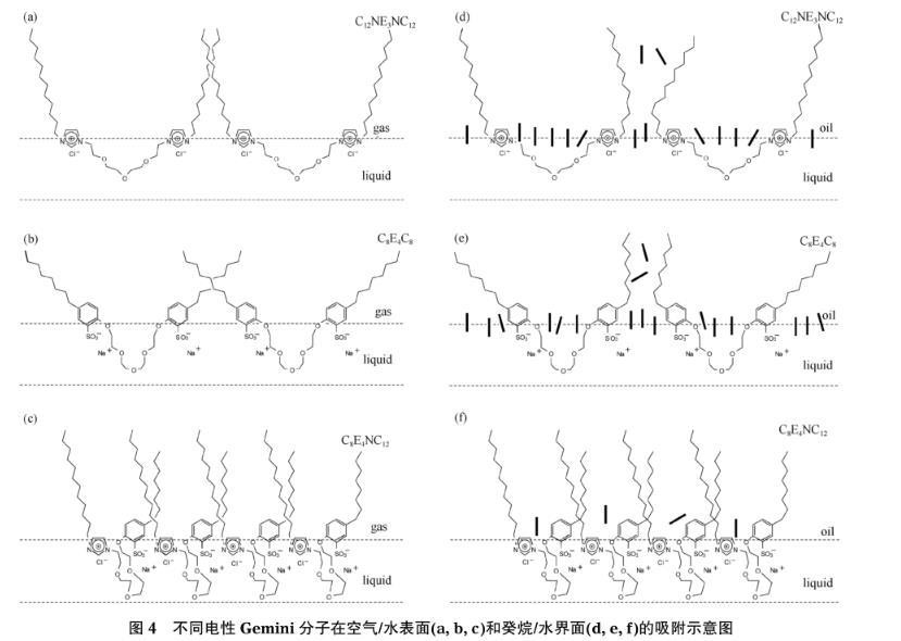 图4不同电性Gemini分子在空气/水表面(a,b,c)和癸烷/水界面(d,e,f)的吸附示意图
