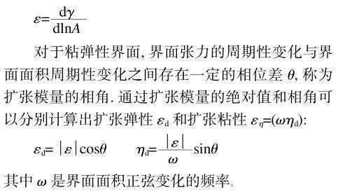 当界面受到周期性压缩和扩张时,界面张力也随之发生周期性变化,扩张模量ε定义为界面张力(γ)变化相对于相对界面面积(A)变化的比值。即