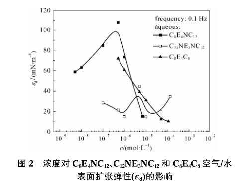 图2浓度对C8E4NC12、C12NE3NC12和C8E4C8空气/水表面扩张弹性(εd)的影响
