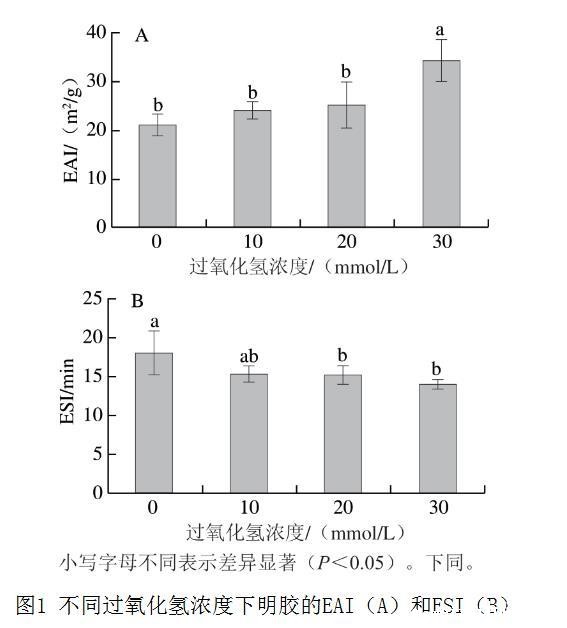 图1 不同过氧化氢浓度下明胶的EAI(A)和ESI(B)
