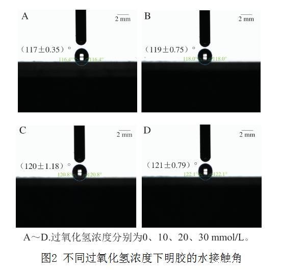 水接触角可以反映明胶的表面两亲性。如图2所示,随着过氧化氢浓度的增加,明胶水接触角增加,从未氧化组的117°增加到30 mmol/L过氧化氢组的121°。水接触角的增加可能归因于蛋白质疏水性的增强。Feng Xin等支持这一观点,并表示利用喷雾干燥技术提取明胶后,明胶疏水性的增加提高了水接触角。这可能归因于喷雾干燥技术可以暴露出明胶中更多的疏水基团,从而表现出更好的疏水性能并改善明胶的两亲性,并且更有利于改善明胶的界面性能和乳化性能。Wang Jin等将明胶和儿茶素混合制备纳米颗粒,发现蛋白质-多酚纳米颗粒的自组装过程中,明胶的疏水基团暴露于水相,因此蛋白质-多酚纳米颗粒表现出更高的疏水性能,从而牢固吸附在油-水界面上,提高乳液的稳定性。