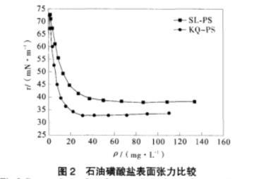 通过相关研究认为,石油磺酸盐在降低原油-水面张力方面具有优良特性,被广泛的应用在石油驱油中。研究认为以原油馏分与康醛抽出油因为原材料成分不同,其表面张力也不同,具体如图2所示。