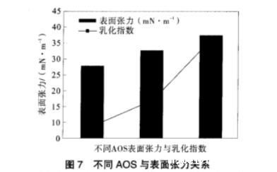 通过数据统计看出,AOS表面张力与乳化指数的关系则如图7所示。