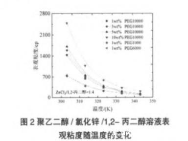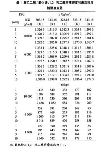 表1聚乙二醇/氯化锌/1,2-丙二醇溶液密度和表观粘度随温度变化